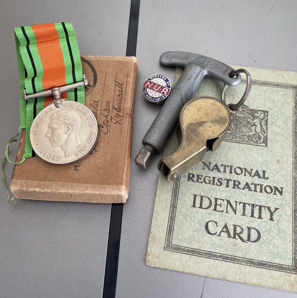 À partir de 1939, il aurait été considéré comme un travailleur essentiel à l'effort de guerre et aurait dû affronter de nombreux dangers, comme le montre la photo ci-dessus. Je crois que l'homme qui se promène sur le quai (à l'extrême gauche) est mon grand-père, venu réparer la conduite d'eau principale rompue. À cette époque, il était membre de la Home Guard des chemins de fer ; je crois que sa section était responsable de la gare de marchandises de Fratton. Son service rendu à la patrie lui a valu la médaille de la Défense 1939-1945, que je conserve encore dans son écrin d'origine.